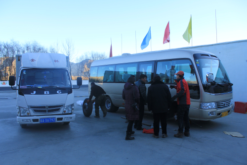 19日清晨7時(shí),滿載物資的貨車本應(yīng)準(zhǔn)時(shí)從拉薩市出發(fā),前往日喀則目的地,但剛準(zhǔn)備出發(fā),我們的貨車卻因天氣寒冷,在香格里拉酒店的坡道上熄火。天氣太冷,發(fā)動(dòng)機(jī)打不著火,這可急壞了大家伙,當(dāng)下,大家紛紛下車,一起推車。所幸,最終貨車重新啟動(dòng)!可在汽車行駛至拉薩機(jī)場(chǎng)附近時(shí),我們的客車又被利物刺破了前輪,并且由于天色尚早,附近的幾處修理廠皆是大門緊閉,尚未開門,好在加油站的工作人員替我們打了電話,找來(lái)了一位修車師傅!