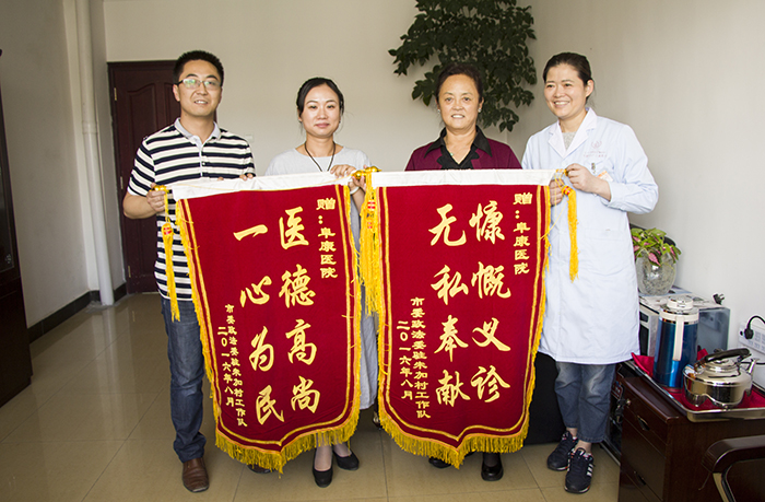 8月8日,為了表彰阜康醫院對林周縣朱加村和甘曲村人民群眾衛生健康意識的提高和衛生保健體系的完善所做出的貢獻,市委政法委駐朱加村、甘曲村工作隊特意為阜康醫院送來錦旗,以示感謝和表彰,阜康醫院總院長敖德秀同志、阜康醫院副院長扎西頓珠同志代表阜康醫院接受了表彰。敖德秀總院長表示,我們阜康醫院一定會再接再厲把健康帶到西藏的各個村落,為西藏人民的健康事業做出應有的貢獻。