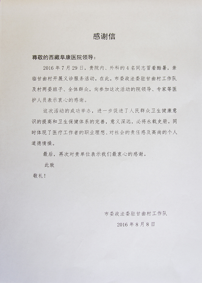▲市委政法委駐朱加村、甘曲村工作隊特意為阜康醫院送來感謝信