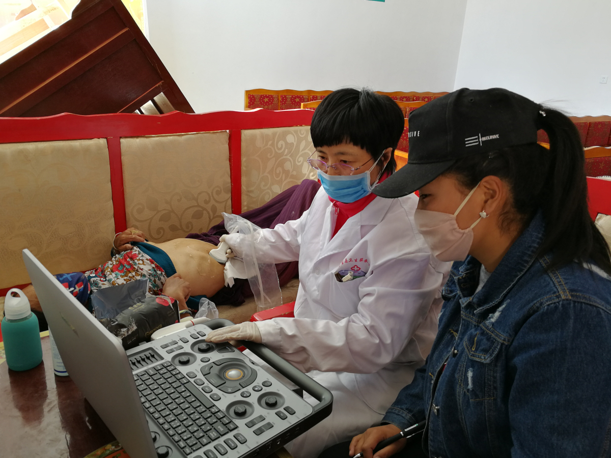 劉冬梅醫生和格桑拉吉被分到一組,負責B超檢查,在這里大部分群眾不會漢語,格桑拉吉除了要負責B超檢查、做錄入還要負責翻譯工作。遵照黨委書記王斌同志的指示,劉冬梅醫生除了要高質量地完成政府安排的肝臟B超檢查外,還要額外為群眾檢查膽、腎臟,這無疑極大地增加了她的工作量。在工作中的她兢兢業業,一絲不茍,那專注的神情,是我見過的最美的樣子。