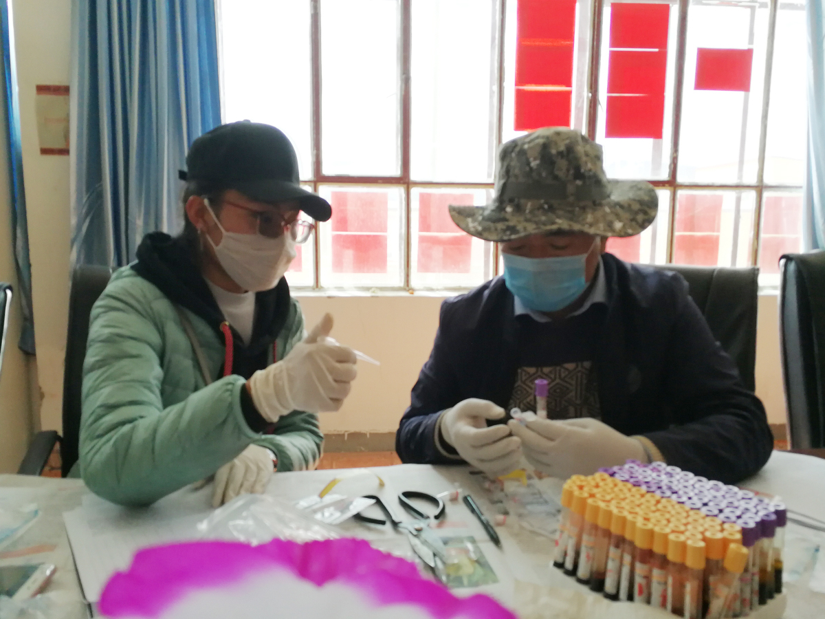 鐘義華、劉亞美、丁雪琴分到另一組,負責采血和血樣信息錄入工作。鐘義華是檢驗士也是隊長,更是我們醫療隊唯一的男孩子,重活、粗活全包,還要負責隊員的工作安排,以及與政府領導、工作人員的溝通協調,除此之外,他還要負責血樣采集、包蟲病防治的宣傳。