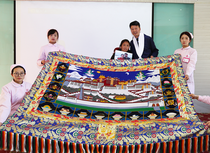 梅朵在出生后不久就被查出患有食道閉鎖、肛門畸形,在阜康全額資助下赴成都手術。手術后,梅朵的身體還是不太好,近兩年經常住院,阜康醫院又為她減免全部的醫療費用,為了表達對阜康的感激之情,梅朵媽媽用3年時間,編織了一幅布達拉宮唐卡,在活動現場送給了王斌書記。