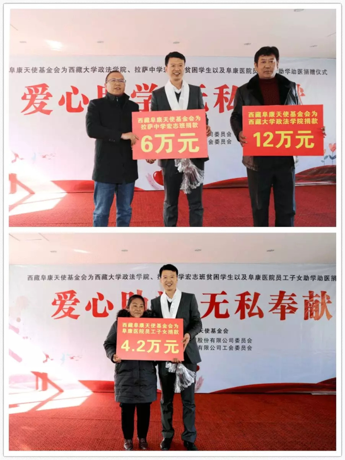 本次捐贈儀式,西藏阜康天使基金會為西藏大學政法學院30名貧困學生,每人每年捐助4000元的生活補貼,總金額為120000元人民幣;為拉薩中學宏志班10名學生,每人每年6000元的生活補貼,總金額60000元人民幣;為阜康醫院內部6名貧困員工的子女(4名助學;2名助醫)給予助學助醫補助,每人每年6000元,總金額36000元人民幣。為社會學生2名(1名高中生、1名大學生);每人6000元,共計12000元人民幣。此次捐贈總金額為228000元人民幣。此外阜康醫院還分別為西藏大學政法學院20名和拉薩中學20名身體存在健康隱患的學生開通綠色體檢通道。