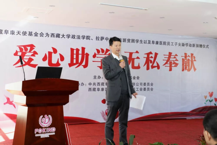 拉薩中學校長陳飛,向西藏阜康天使基金會表示了衷心的感謝。他表示:阜康是西藏民營醫療行業的典范,王斌董事長在發展事業的同時,從未忘記回饋社會,成立阜康天使基金會,慷慨解囊,幫助西藏教育事業的發展,切實體現了“仁心仁術,止于至善”的阜康企業文化精神。