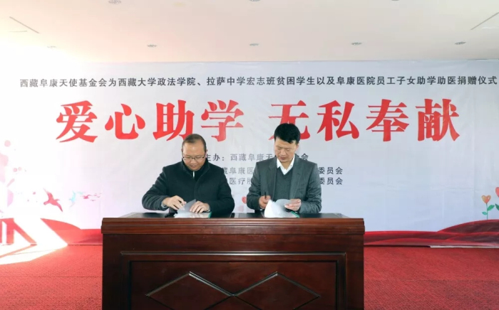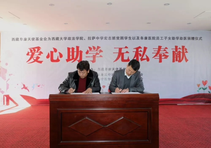西藏阜康天使基金會理事長、西藏阜康醫療股份有限公司黨委書記、董事長王斌與西藏大學政法學院黨委書記羅布簽訂捐助協議