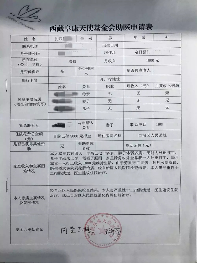 據了解,扎西因勞累患上胃病,在縣醫院的建議下轉至自治區人民醫院治療,經自治區人民醫院檢查確診為:十二指腸潰瘍,建議入院治療。但扎西的家庭十分困難,妻子體弱多病,全家僅靠扎心每月打工收入1800元維持生活,無力支付醫療費用。在社會好心人士的介紹下,向阜康天使基金會提出了助醫申請。