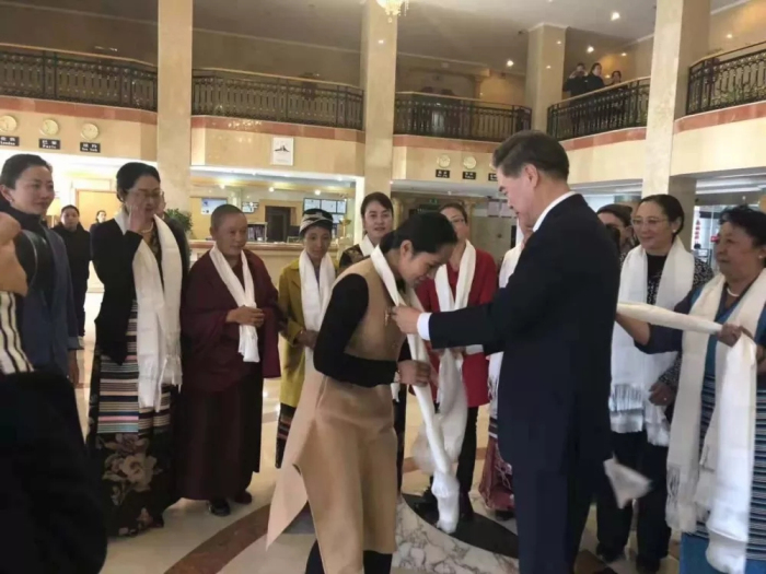 西藏自治區黨委常委、組織部部長曾萬明為西藏阜康醫藥發展有限公司總經理劉瀟瀟女士獻上潔白的哈達
