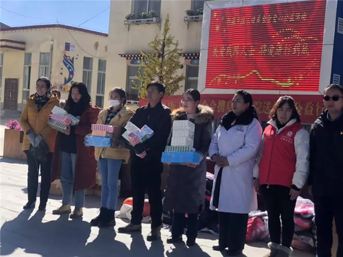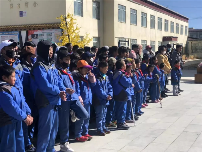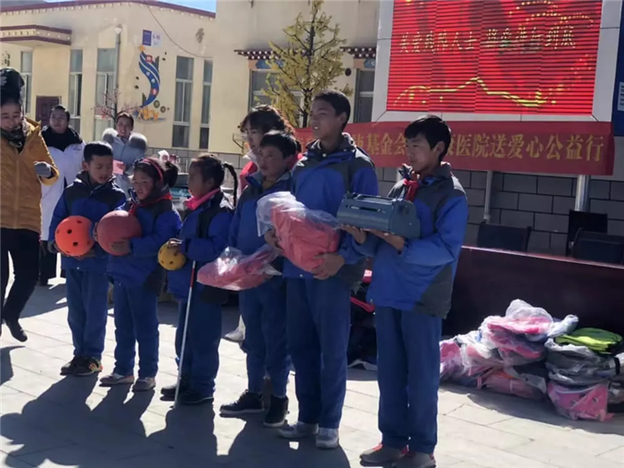 11月1日上午,西藏阜康天使基金會吉拉女士受西藏阜康醫療股份有限公司黨委書記、阜康天使基金會會長王斌先生,西藏阜康醫療股份有限公司總經理、阜康天使基金會秘書長劉瀟瀟女士委托與西藏阜康醫院義診隊一起,攜價值一萬五千元的藥品和兩萬元的物資來到那曲市特殊教育學校,為這里的孩子們帶來了文化體育學習用品及藥品等物資。在特校校長次仁拉姆的組織下,特校師生列隊歡迎我們的到來,還精心準備了錦旗和潔白的哈達。