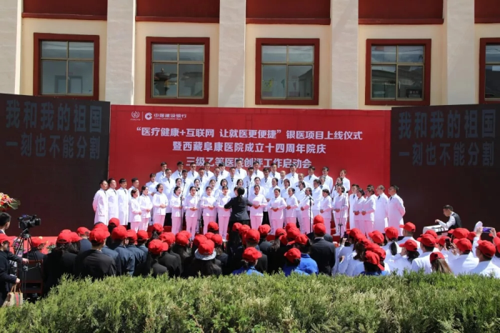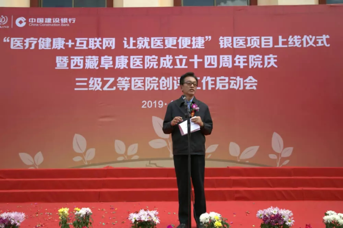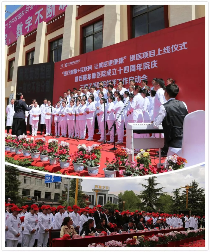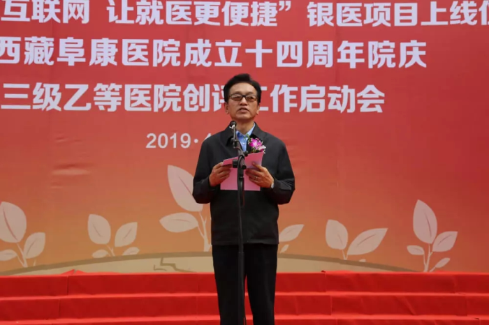 春日的圣城拉薩陽光明媚,生機盎然。2019年4月28日,注定是一個不平凡的日子!下午15時,來自自治區政府部門、各大金融機構、科技教育單位的12位嘉賓和阜康醫院的廣大醫務人員匯聚一堂,共同見證建設銀行西藏分行、西藏阜康醫院“醫療健康+互聯網,讓就醫更健康”銀醫項目上線暨阜康醫院成立十四周年院慶三級乙等醫院創評工作正式啟動,標志著在雪域高原上成功走過十四年光輝歷程的阜康醫院,正在一個全新的起點上承載著“健康西藏”的光榮使命再次揚帆遠航、整裝出發!
