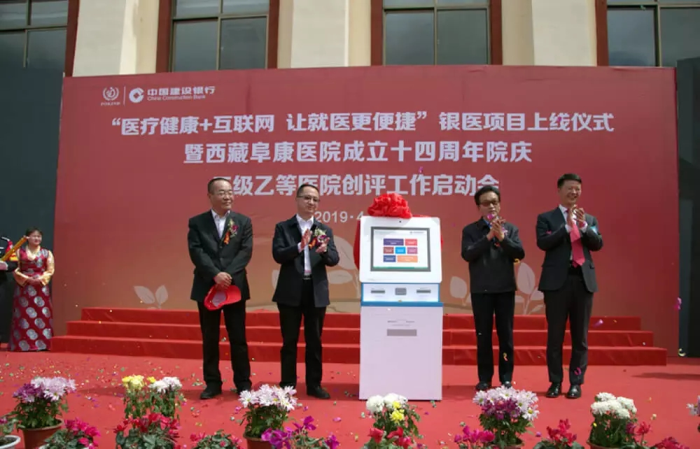 西藏自治區政協副主席、區工商聯主席阿沛·晉源,中國建設銀行西藏自治區分行黨委委員、副行長鄧存云,中國建設銀行北京中路支行行長高鵬,西藏阜康醫療股份有限公司黨委書記、董事長王斌共同為建行自助終端一體機揭牌;阜康醫院滿14周年員工以及14周年院慶活動獲獎科室代表分別上臺領獎。