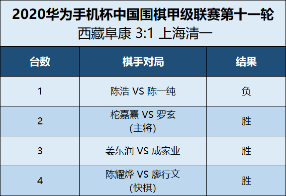 12月8日,2020華為手機杯圍棋甲級聯賽在成都武侯進行第11輪的比拼,西藏阜康隊對陣上海清一隊。十輪戰罷,西藏阜康隊以2:2主將勝江西金達萊環保隊,排名第八。