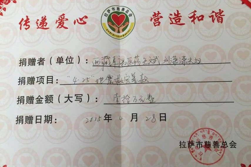 在西藏,哪家有災(zāi)哪家有難,在王斌董事長(zhǎng)知情的情況下,都會(huì)伸出援助之手,這次尼泊爾地震,除了醫(yī)院募捐的現(xiàn)金205682元外,王總私人還拿出了十萬(wàn)元捐贈(zèng)給災(zāi)區(qū),希望自己的綿薄之力能助災(zāi)區(qū)人民早日走出陰霾。