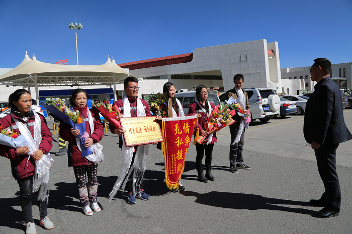 ? 值此秋高氣爽、碩果累累的豐收季節,10月23日,阜康醫療隊圓滿完成阿里地區包蟲病義務篩查任務,滿載榮譽而歸,隨著醫療隊全體成員從拉薩機場緩緩走出,陳彬副書記代表公司黨委對他們表示了熱烈的歡迎,并為每位隊員獻上鮮花和哈達,歡迎他們回家。