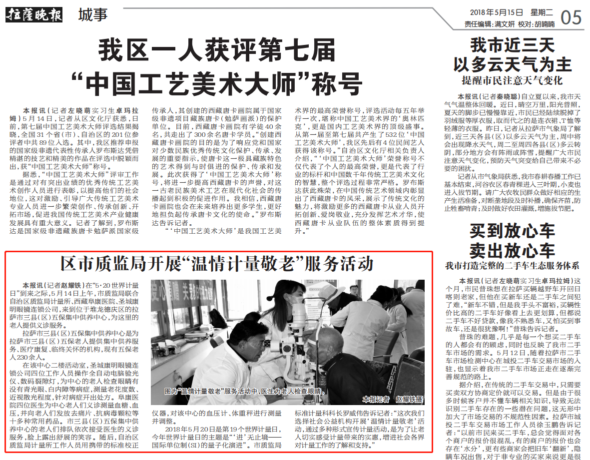 本報訊(記者趙耀鐵)在“5·20世界計量日”到來之際,5月14日上午,市質監局聯合自治區質監局計量所、西藏阜康醫院、圣城康明眼鏡連鎖公司,來到位于堆龍德慶區的拉薩市三縣(區)五保集中供養中心,為這里的老人提供義診服務。