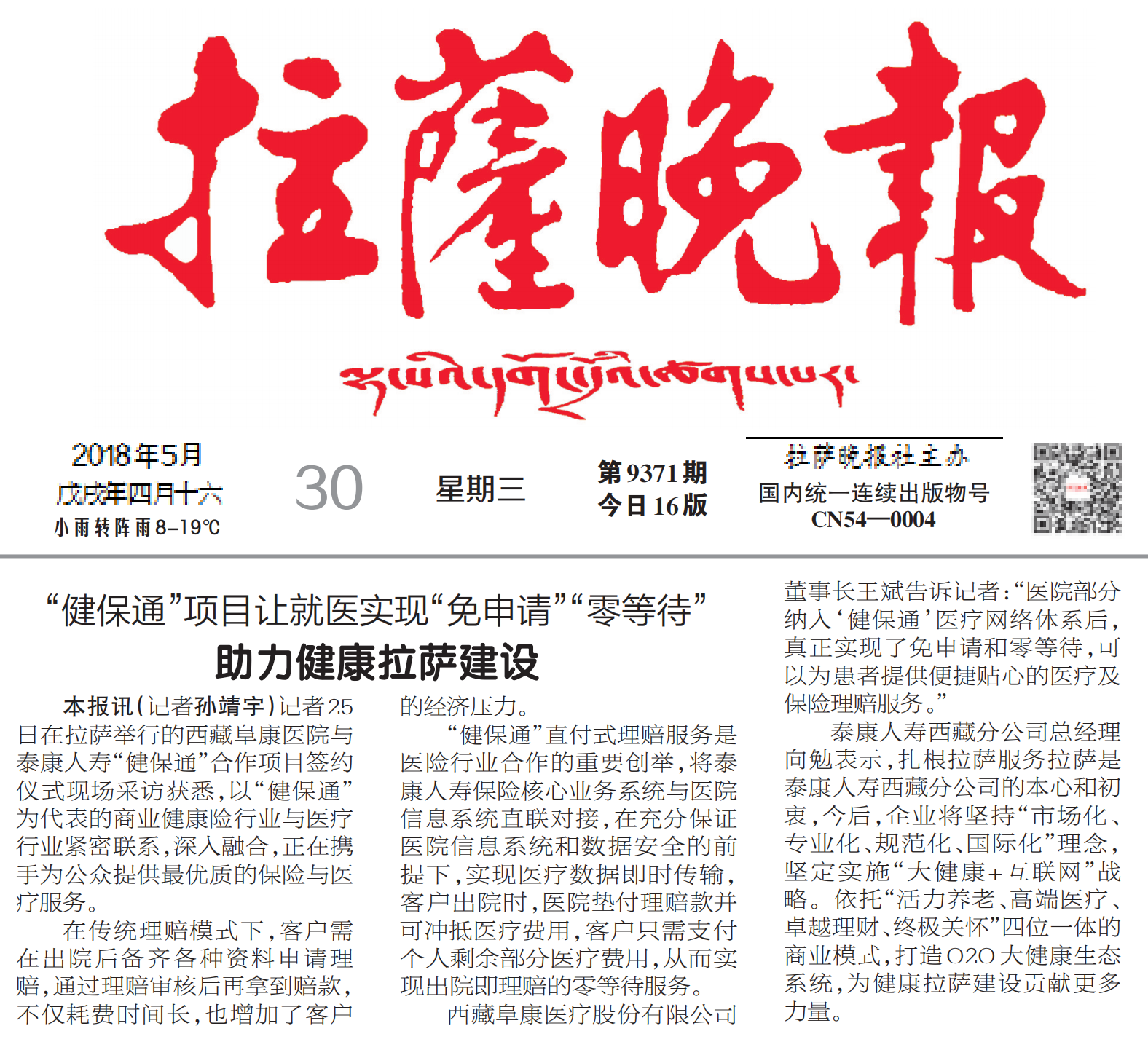 西藏阜康醫(yī)療股份有限公司董事長王斌告訴記者:“醫(yī)院部分納入‘健保通’醫(yī)療網(wǎng)絡(luò)體系后,真正實(shí)現(xiàn)了免申請和零等待,可以為患者提供便捷貼心的醫(yī)療及保險(xiǎn)理賠服務(wù)。”