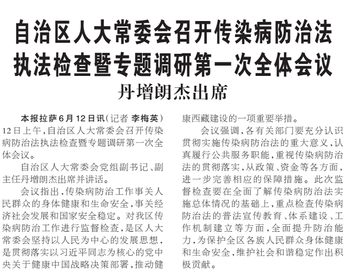 本報拉薩6月12日訊(記者 李梅英)12日上午,自治區人大常委會召開傳染病防治法執法檢查暨專題調研第一次全體會議。