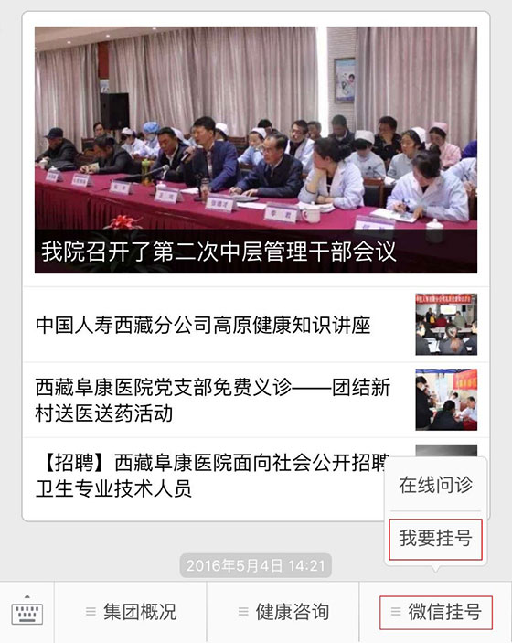 西藏阜康醫(yī)院微信公眾平臺(tái)網(wǎng)上預(yù)約掛號(hào)系統(tǒng)現(xiàn)已正式上線,可提供微信掛號(hào)、在線問診、健康咨詢、新聞動(dòng)態(tài)等服務(wù),我們通過信息的推送,增加與新老朋友的互動(dòng)。