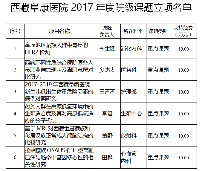這是我院首次組織申報并批準立項的院級課題。課題主持人均為我院醫務人員。本年度立項資助的6個課題均為院級重點課題,每項課題將提供10萬元的研究經費。課題自2017年10月1日正式實施,期限為兩年。