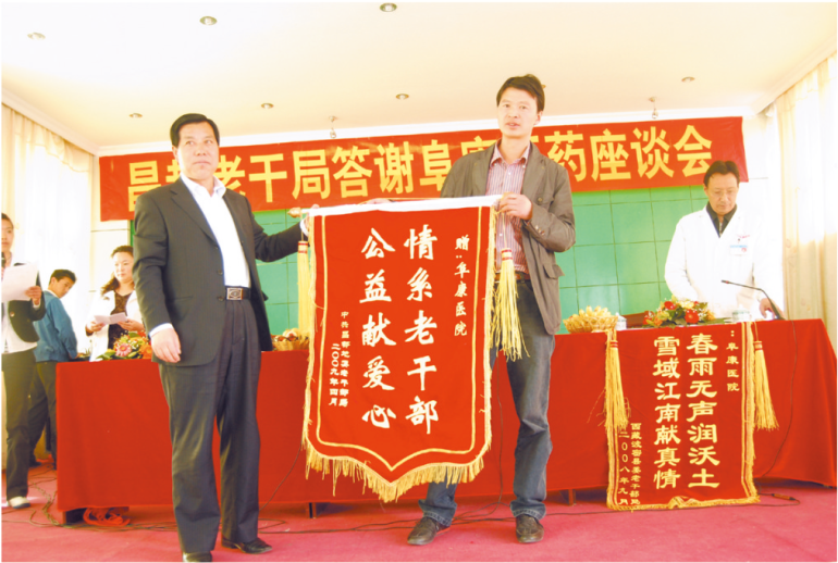 2009年4月29日.上午,阜康醫院在醫院康復中心召開了” 昌都老干局答謝阜康公司座談會”,昌都地委老干部局局長張定杰、自治區黨委老干部局安置處處長謝青林、自治區黨委老干部局安置處主任科員麻召法、阜康醫藥發展有限公司董事長王斌、阜康醫院院長嘎布、阜康醫院黨支部書記張德才參加了座談會,昌都地委老干部局張定杰局長及自治區黨委老干部局安置處謝青林處長代表波密縣老干部局向阜康醫院獻上錦旗,以答謝阜康公司對昌都老干部的關心和援助。