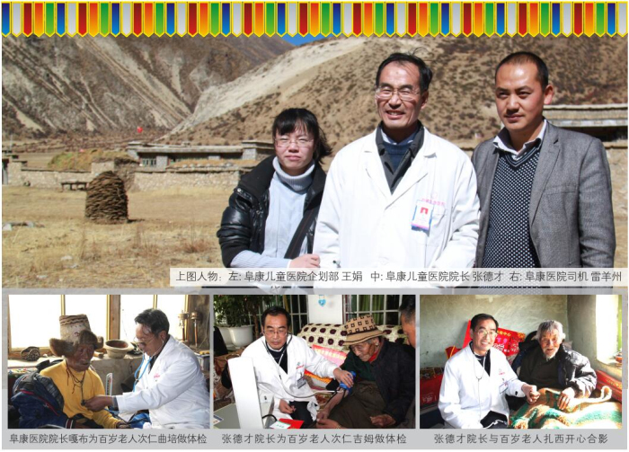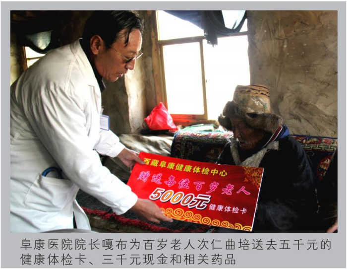 西藏高寒缺氧,自然環境惡劣。60多年前,這里的人均壽命才35.5歲。然而到了2012年,光拉薩的七縣一區就有16位百歲老人,正是這些百歲老人,見證了西藏翻天覆地的巨變,他們是全社會的寶貴財富,更是西藏從貧窮落后走向繁榮富強的親歷者、見證者。在全國人民喜迎黨的十八大勝利召開之際,西藏阜康(國際)健康體檢中心與拉薩市民政局老齡辦組織發起了“關愛百歲老人行動”。此次行動歷時16天,里程2000多公里,尋訪了拉薩七縣一區十一位百歲老人,不僅為每位老人送上了精心準備的三千元現金、五千元健康體檢卡、一個便攜式氧氣瓶、一個便攜式血壓儀,還為他們送上了免費義診和相關藥品。王斌董事長參加了此項活動的啟動儀式,嘎布院長、張德才院長親自帶隊為每一位百歲老人做了常規的身體檢查,并送上了藥品和祝福。
