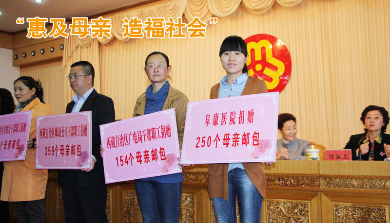 2013年5月1日上年十點,西藏自治區“母親郵包”公益活動暨捐贈儀式在自治區常委會議室內正式啟動。西藏阜康集團懷著高度的社會責任感心系天下母親,當天共捐贈總價值五萬元的郵包250個,并呼吁全體阜康人為天下母親捐贈郵包,奉獻自己的愛心。