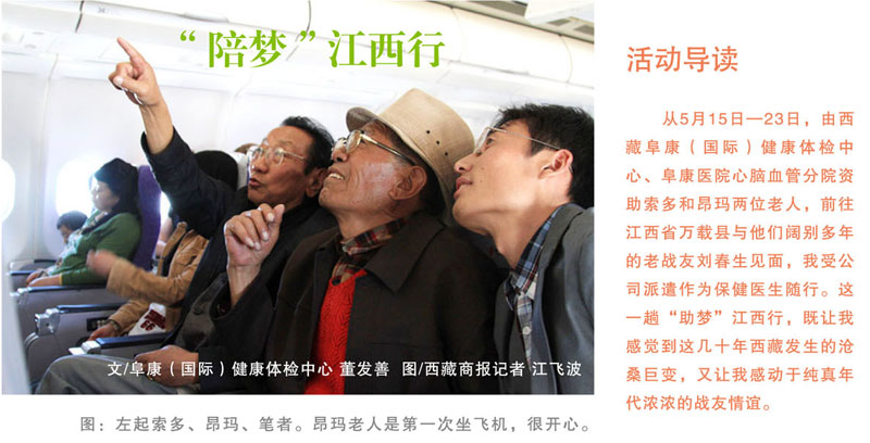 我們5月15日從拉薩出發,一路向東,到成都轉機,兩天的時間,已經跨越了2400多公里。16日,載著夢想的飛機抵達了江西南昌機場,劉春生老人的大兒子在機場熱情地迎接我們,將我們接到老人的故鄉萬載縣。我們決定在縣城賓館休息一天后再啟程前往劉春生老人的家,于是我為同行的兩位老人做了全面的檢查,索多老人的血糖在7.0mmol/L左右,令我擔心的是昂瑪老人血壓本來就偏高而且又是第一次去內地,他的血壓波動在140-150/90-100mmHg,比較平穩,我叮囑老人見面時注意控制情緒,不要過于激動。