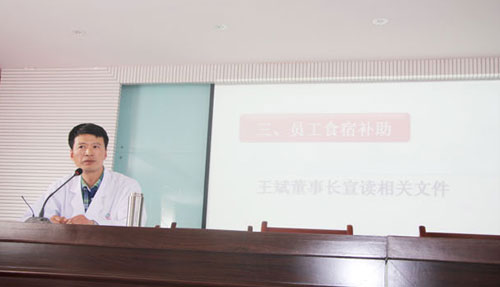 在談到員工食宿補助時,王斌董事長宣讀了相關文件,并就一些問題做出了解釋:員工的食堂補助由原來的四百元上漲到五百元;從六月份起,由三家醫院拿出部分收入補貼員工住宿,如此住宿補貼由原來的一百四十元上漲到二百四十元。以此來提高全體員工的食宿質量,并以此來保證低收入者不為一日三餐所發愁,減輕低收入者們的生活壓力。為此,王斌董事長還要求綜合辦公室下發文件,要求食堂提高飯菜質量,保證員工吃上品種多樣且營養又衛生的飯菜。對此,張德才院長發表了自己的一些看法,也談了關于食堂的一些改革,并對王斌董事長的這項決議表示了大力支持。