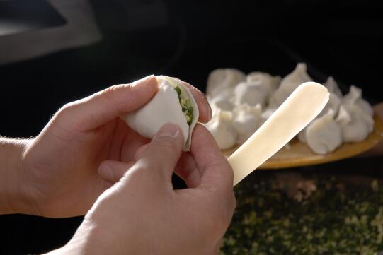看著爺爺搟面皮會覺得很過癮,這活兒我和弟弟卻干不了。于是,爺爺會找出一個杯蓋,將面皮搟出一大張,我跟弟弟就拿著杯蓋一個一個的按,按好的面皮變成了一張一張的圓。爺爺包的餃子很好看,也很飽滿,照著爺爺教我們的方法包出來的餃子,卻是形狀各異的。盡管這樣,我們還是會很開心。