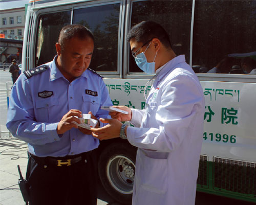 西藏阜康(國際)健康體檢中心根據民警們的職業特點,量身定制了體檢套餐。張德才院長介紹說:“為不耽誤民警的工作時間,醫院決定將體檢車直接開到民警的便民執勤點,由專業醫護人員為民警進行血壓測量、心電圖測量、B超等方面的檢查。