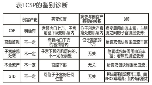 CSP患者全部都有明確的剖宮產史,胎囊著床在剖宮產瘢痕內,周圍有豐富的血流,瘢痕處肌壁變薄。在臨床工作中,CSP易與宮頸妊娠、子宮峽部妊娠、不全流產和滋養細胞疾病相混淆,需要仔細鑒別。一般通過病史、妊娠囊位置和B超檢查鑒別必要時可行血清βHCG、肺CT和病理檢查。
