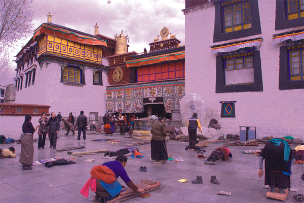 前幾天在大昭寺廣場,看人們磕長頭。人很多,其中多數應該是牧區上來的,臟亂的衣服,掩不住滿眼的虔誠。有的人累了,便坐在那里和身邊的一或兩人輕聲地說話,大多數人,則是重復著相同的動作:面向大昭寺,不停起身,然后跪倒全身俯地……從早到晚,日復一日,簡單而長久。