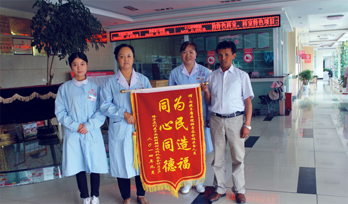 2014年阜康義診隊奔赴山南地區(qū)隆子縣開展免費義診送醫(yī)送藥活動,共有300多名村民就診,發(fā)放藥品2萬余元。為了向阜康醫(yī)護人員表示感謝,2015年7月30日山南地區(qū)社保局醫(yī)保中心主任邊旦次仁,代表隆子縣列麥鄉(xiāng)西徒村駐村工作隊及全村88戶村民來到阜康醫(yī)院婦產(chǎn)兒童分院,為我院醫(yī)務人員送來了感謝錦旗,敖德秀院長作為院方代表接受了這份榮譽。