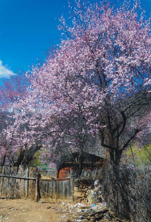桃花溝對于外人只當闖入了陶淵明筆下的“桃花源”,而對于波密人,這只是一個普通的村落。這些桃樹都是野生的,有的上百年,甚至上千年,一個人抱的樹是最常見的,兩三人合抱的也屢見不鮮。這些野桃樹不只是大而且多,田間、屋后、路邊、山中隨處能見到三三兩兩挺立著。最多的是在山坡上,常常是漫山遍野,呼拉拉總有成千上萬的感覺。花色雖柔美,卻從骨子里透出高原的雄渾和雪域驕傲的氣勢,藍天之下,碧水之畔,妖嬈多姿。每年三月中旬至四月初,漫山遍野的桃花開始鋪滿山坡,綿延至河谷。大株的桃花樹如同桃花仙子,偎依在雪山之下,與云朵相擁,形成密集的桃林。漫步其中,可見雪峰聳立,桃花怒放,清泉嬉戲,藏寨悠然,美到令人窒息。