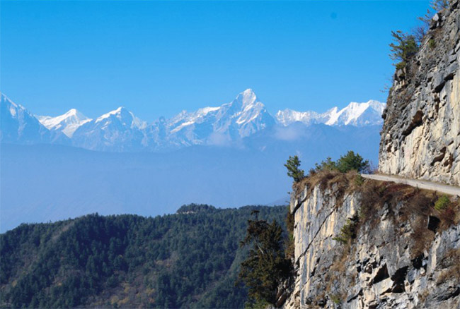前幾天山里一直在下雨,因此道路濕滑,并不好走,我們拄著登山杖,走得很小心,卻仍然免不了摔跤。最初天空陰沉沉的,山間的霧濃得化不開,大家心里免不了有點沮喪,難道這次我們也要帶著遺憾離開嗎?慢慢地,太陽從云層間透出一點點光芒,雖然微弱,卻帶給我們莫大的希望??伤駛€調皮的孩子一樣,給你扮個鬼臉后,一會兒又消失不見了。心情再次低落起來,埋著頭一個勁兒往上沖,期望著到了山頂就能是好天氣。誰知這幸運來的如此之快,走到一半時,山里的霧開始逐漸散開,遠處的雪山一點點顯現出來,就像那害羞的姑娘,在千呼萬喚下終于揭開它那神秘的面紗,雪山連綿不斷,一座接著一座,最引人注目的便是貢嘎群山,它們似乎觸手可及,卻又隔著濤濤云海。我們的激動無以言表,原本已疲憊的身體立刻變得精神抖擻,因為前方還有更美的風景等著我們。