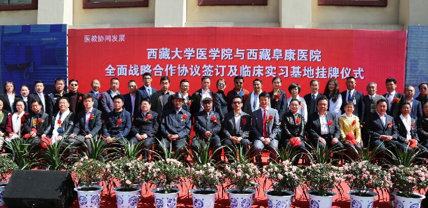 揭牌儀式中,西藏大學黨委委員、紀委書記白瑪衛東與王斌董事長簽訂了“西藏大學醫學院與西藏阜康醫院全面戰略合作協議”,自治區政協副主席、區工商聯主席、自治區總商會會長阿沛·晉源與自治區衛計委副巡視員益西央宗為“西藏大學醫學院臨床實習基地”揭牌。