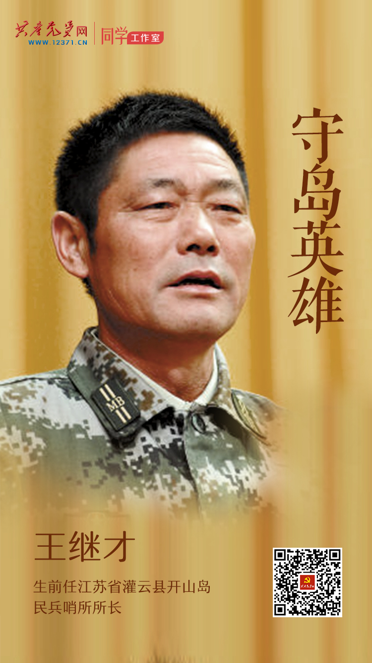 王繼才(1960—2018),江蘇灌云人。2003年10月加入中國共產黨。江蘇省灌云縣開山島民兵哨所原所長、開山島村黨支部原書記。自1986年起,毅然擔起守衛黃海前哨開山島的重任。他和妻子以海島為家、與艱苦為伴,堅持每天升起國旗,每天按時巡島,護航標、寫日志,與走私、偷渡等不法分子作斗爭。2018年7月27日,在執勤期間突發疾病,經搶救無效不幸去世。王繼才夫婦被評為全國“時代楷模”,王繼才后被追授為“全國優秀共產黨員”。